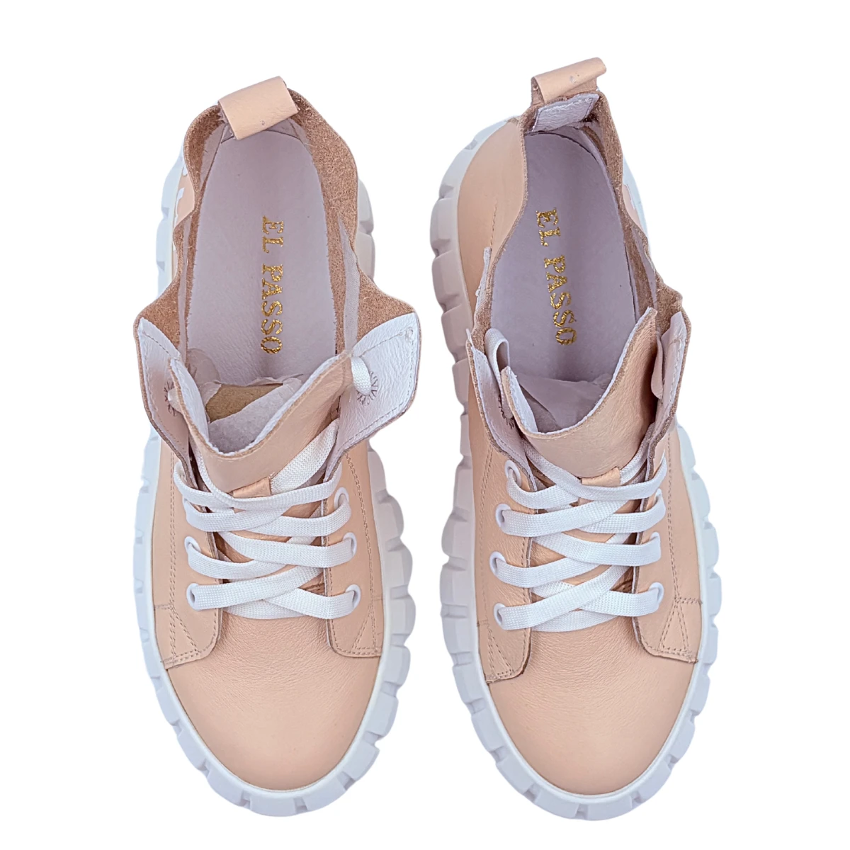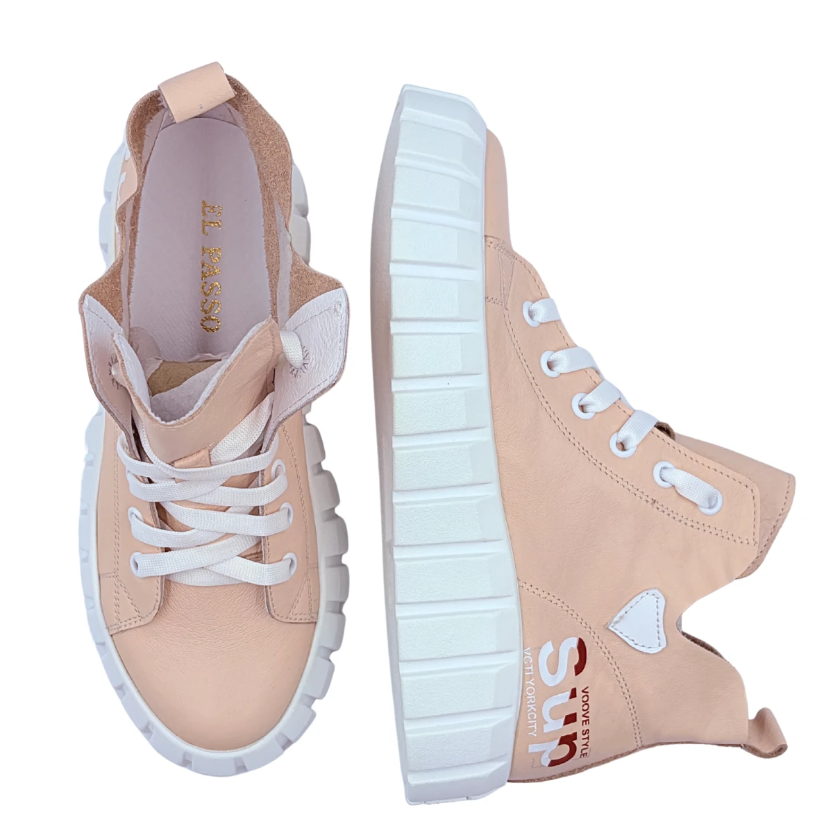 Sneakersy damskie El Passo w delikatnym różowym odcieniu to propozycja dla kobiet, które lubią łączyć wygodę z modnym akcentem. Naturalna skóra zapewnia trwałość i komfort, a biała naszywka w kształcie serca oraz stylowy napis dodają modelowi lekkości i charakteru.