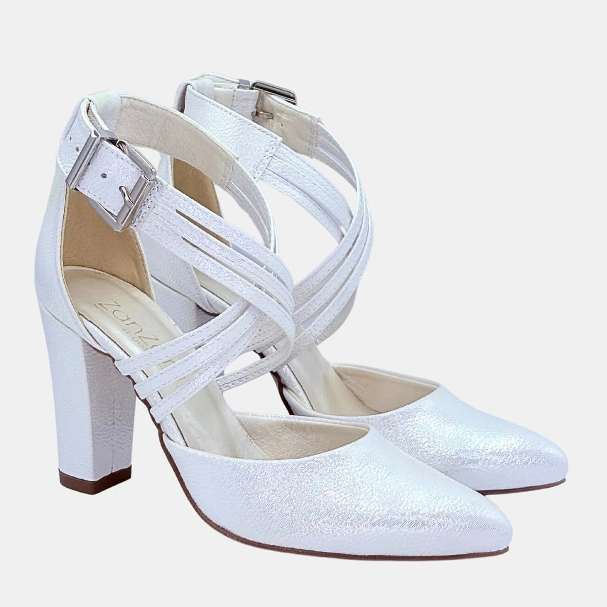Perłowe czółenko ślubne ZAN ZARA z potrójnymi, krzyżującymi się paseczkami to połączenie elegancji i subtelnego blasku. Stabilny słupek 9 cm i migdałowy nosek zapewniają komfort przez cały dzień.