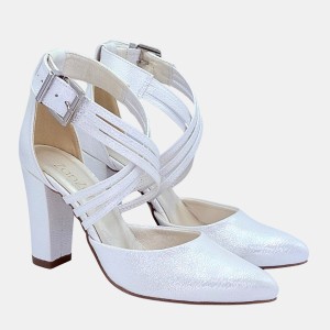 Czółenko posiada unikalny design – potrójne paseczki krzyżujące się na podbiciu stopy, które dodają charakteru i subtelności. Błyszczące, perłowe wykończenie sprawia, że buty wyglądają niezwykle elegancko i będą idealnym dopełnieniem sukni ślubnej.