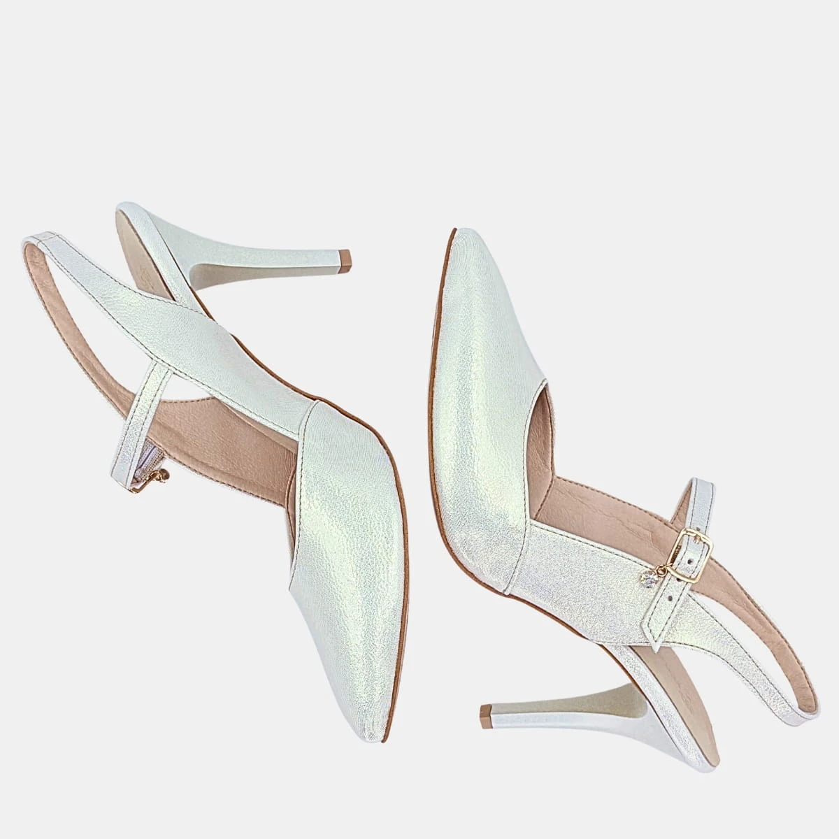 Jasnozłote szpilki STYLOWA PARA z perłowym połyskiem i odkrytą piętą to połączenie elegancji i wygody. Naturalna skóra wewnątrz i smukły obcas 8,5 cm – zamów już dziś i dodaj odrobinę złotego luksusu!