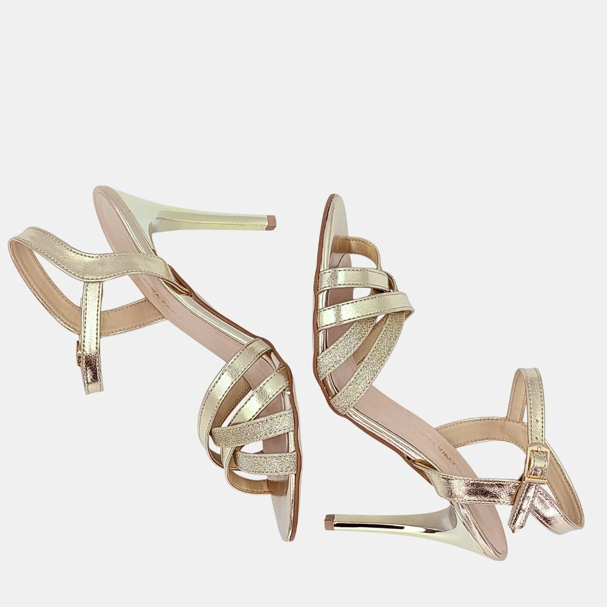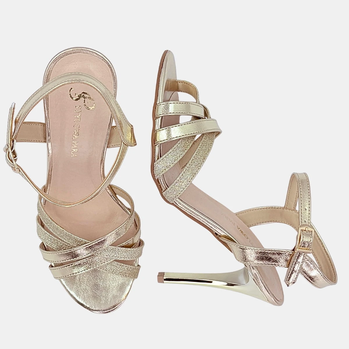 Złote sandały STYLOWA PARA z brokatowymi paskami i szpilką 10 cm to połączenie luksusu i wygody. Idealne na wesele, bal i wieczorne przyjęcia – zamów już dziś i olśniewaj blaskiem przy każdym kroku!